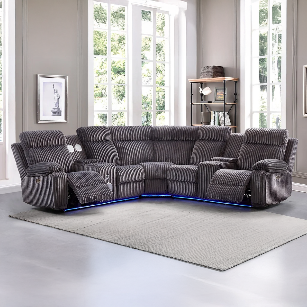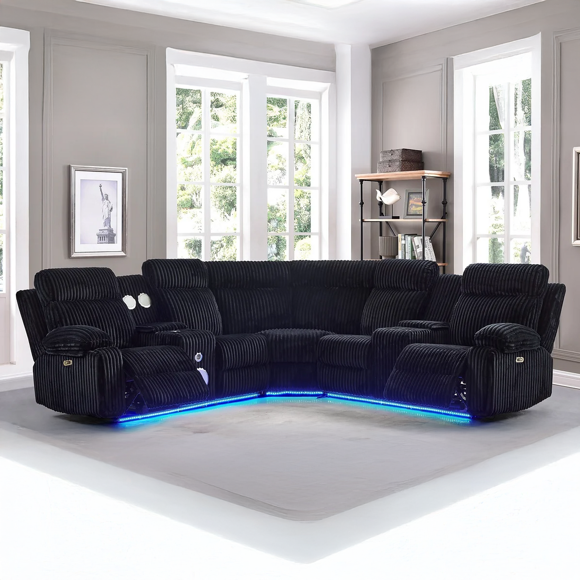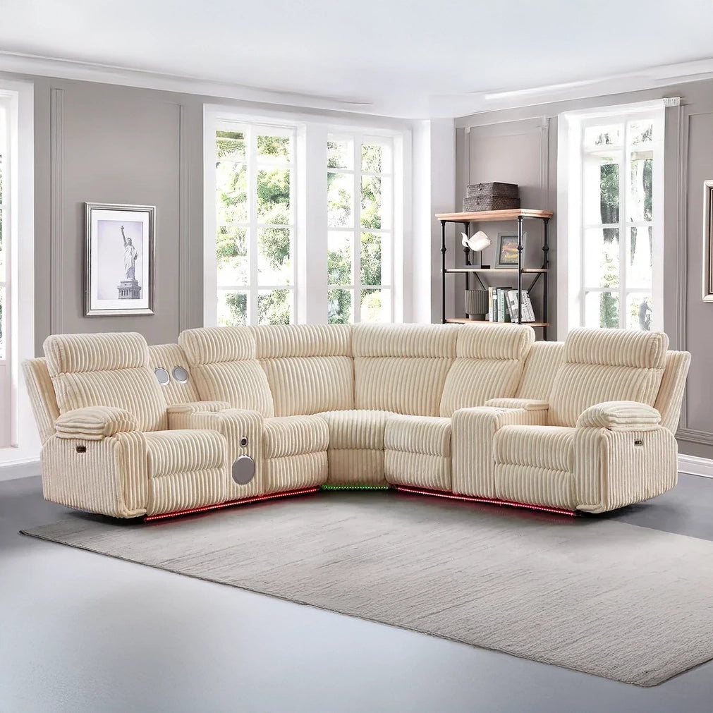 This product is a contemporary L-shaped sectional recliner sofa, upholstered in a soft, cream-colored corduroy fabric with a ribbed texture for added style and comfort. It features plush, padded cushions and armrests, offering superior relaxation. The sofa includes built-in cup holders, integrated speakers for an enhanced entertainment experience, and adjustable reclining mechanisms on both ends. Adding a modern touch, it is equipped with vibrant LED lighting at the base, customizable in multiple colors, perfect for creating an ambient home theater or cozy living space.