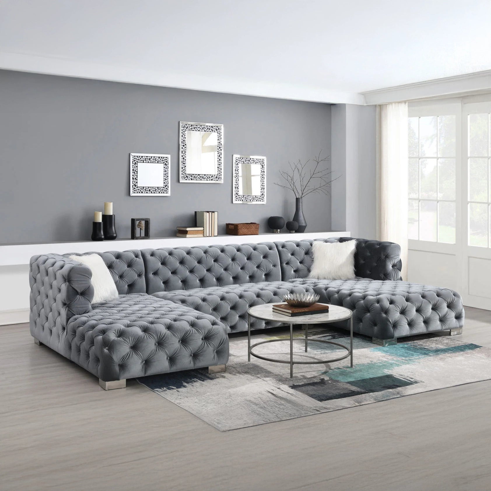 This sectional sofa combines modern design and sophistication with a solid wood frame that ensures stability and durability. Its soft velvet upholstery provides a luxurious and cozy texture, while the tufted design adds a touch of classic elegance. The high-density foam padding in the seats and backrest offers exceptional comfort.