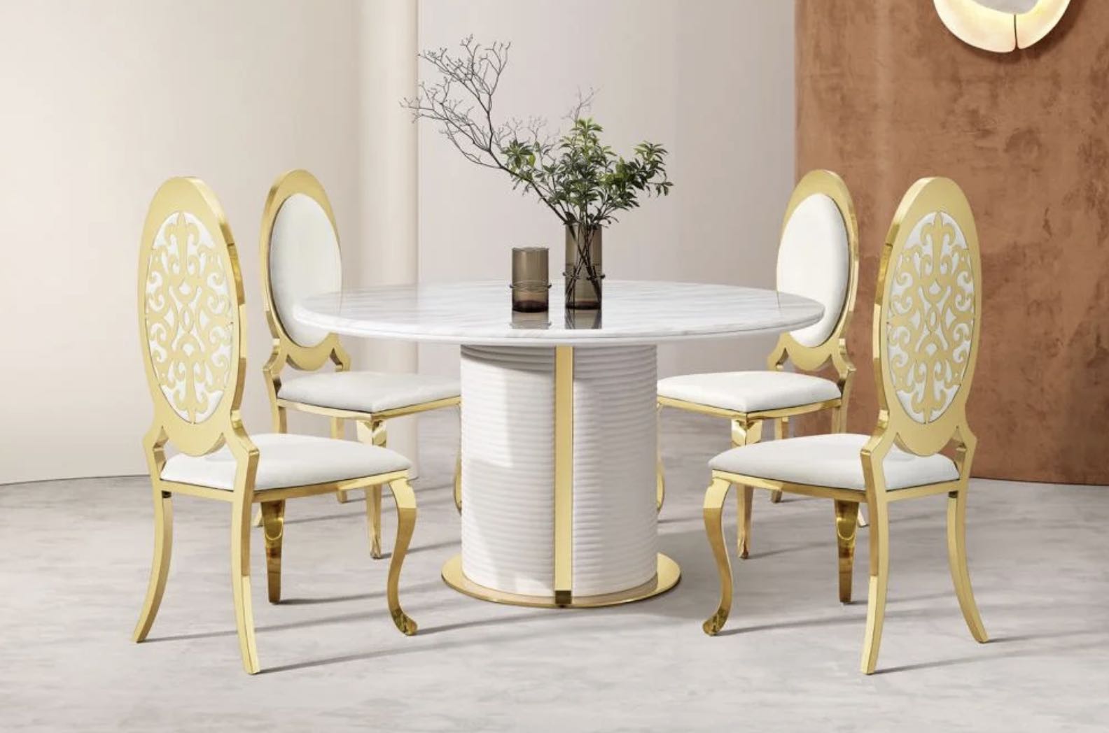 This exquisite dining set features a polished marble tabletop supported by a sleek cylindrical base with gold accents, creating a sophisticated and modern aesthetic. The elegantly designed chairs with intricate gold detailing and plush upholstery offer both style and comfort. Perfect for adding a touch of elegance to any dining space, this set blends timeless luxury with contemporary design.