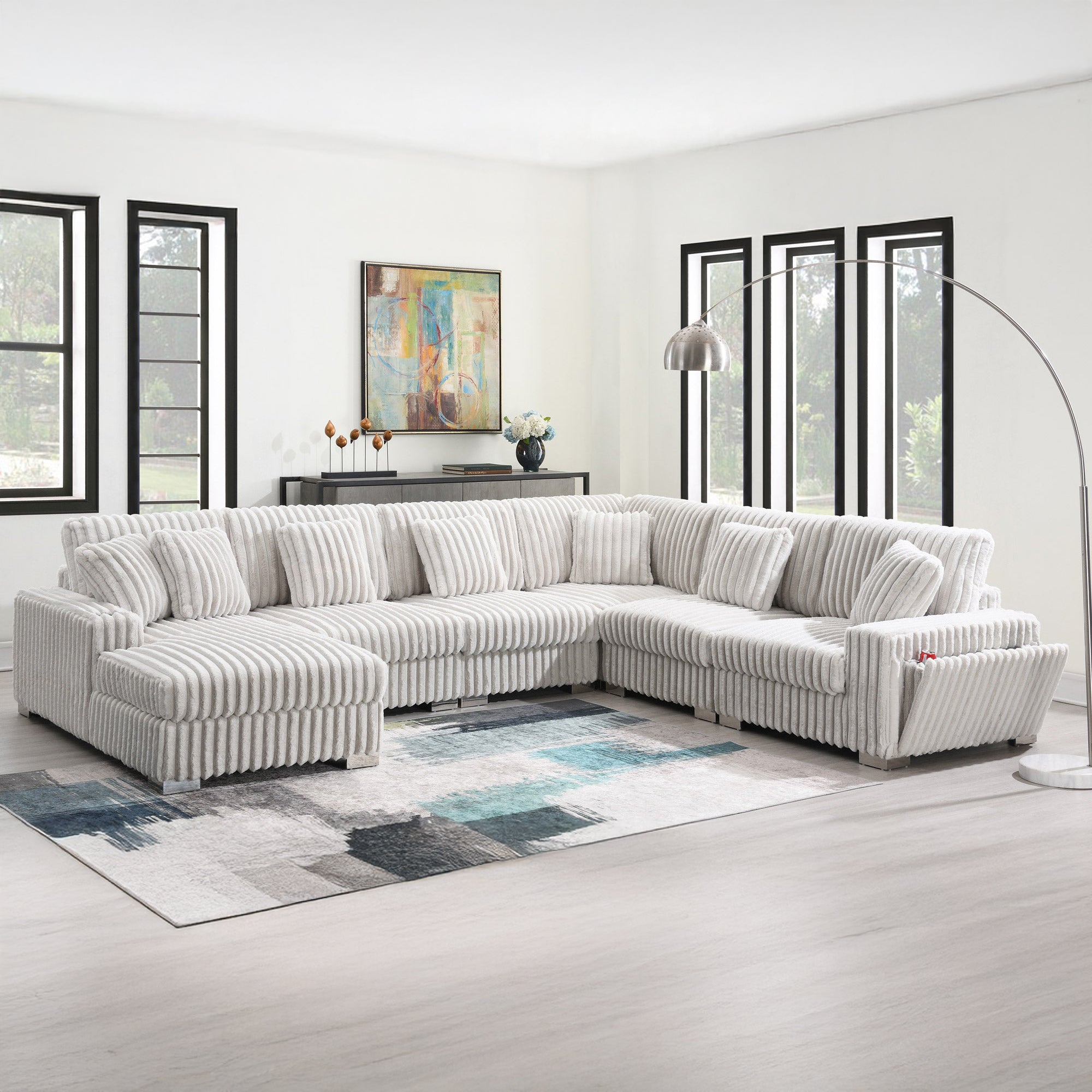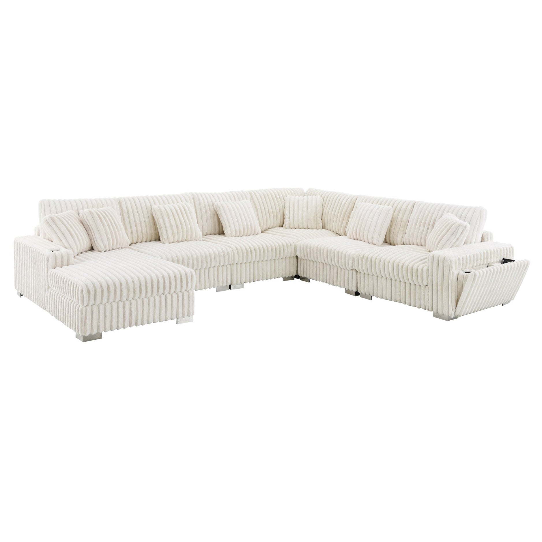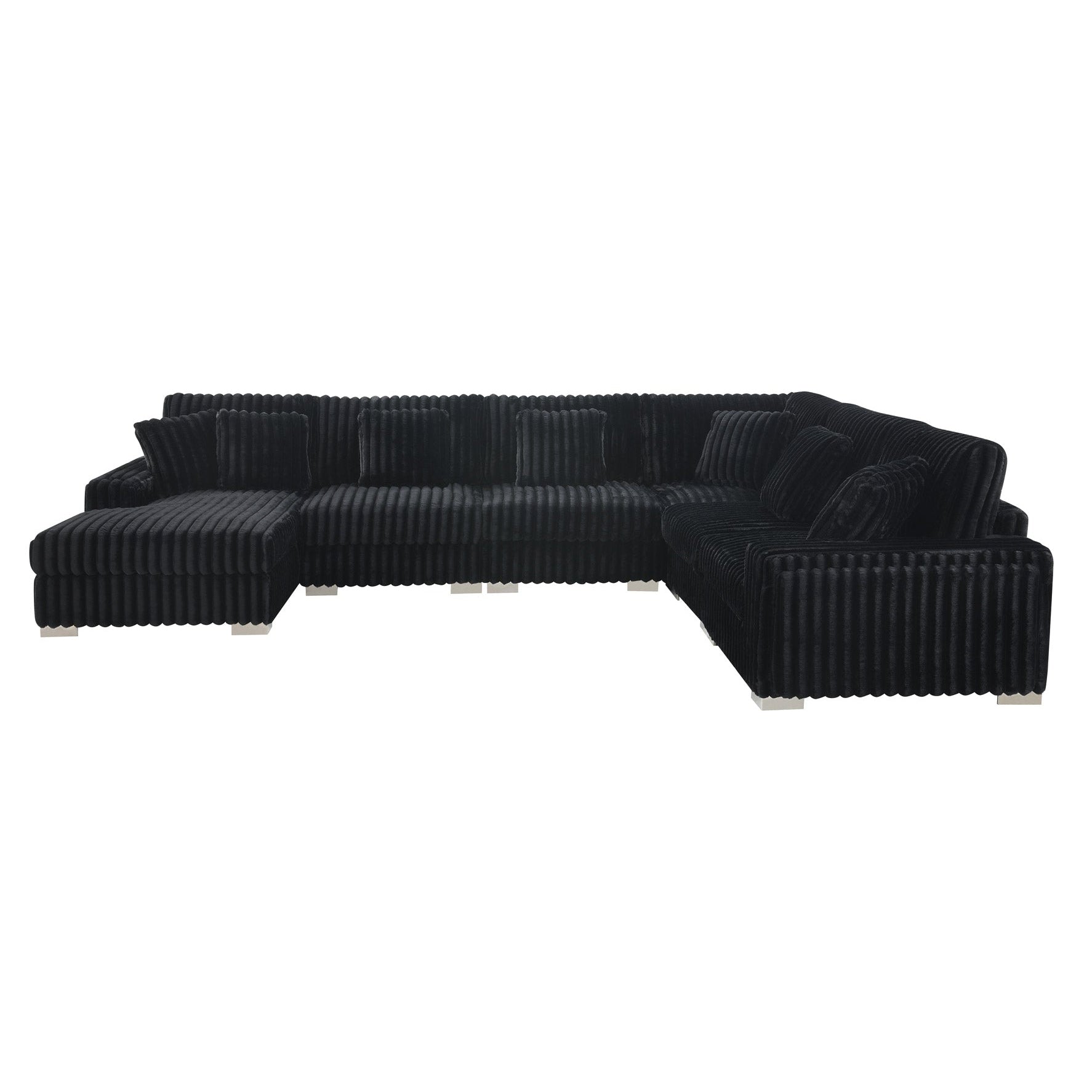 This image showcases a large, U-shaped sectional sofa with a contemporary and luxurious design. It features plush, ribbed upholstery in a deep brown color, offering a warm and sophisticated appearance. The sofa is equipped with multiple matching throw pillows that enhance both comfort and style. Its sturdy metallic or chrome-finished legs provide a modern touch. The spacious design makes it ideal for accommodating larger groups in a living room or lounge area while maintaining an inviting aesthetic.