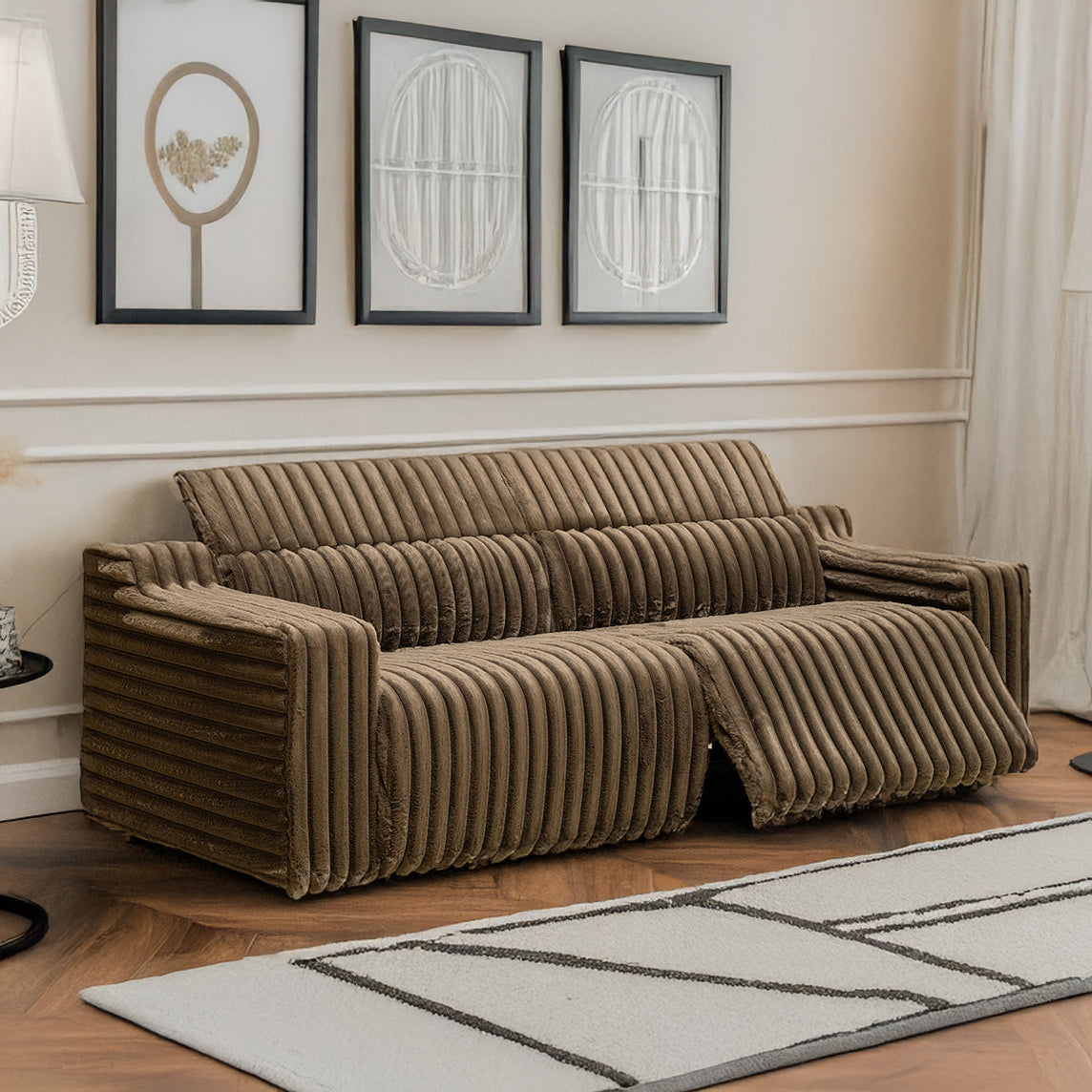 This product is a premium set of dark brown leather recliners, including a three-seater sofa, a loveseat, and a single recliner chair. Crafted for maximum comfort, each piece features plush, high-density cushioning, ergonomic headrests, and smooth reclining mechanisms. The three-seater includes a convenient drop-down center console with cup holders and a storage compartment, perfect for added functionality. The sleek, contemporary design, combined with durable stitching and high-quality leather upholstery, makes this set an excellent choice for both modern living rooms and home theater spaces.